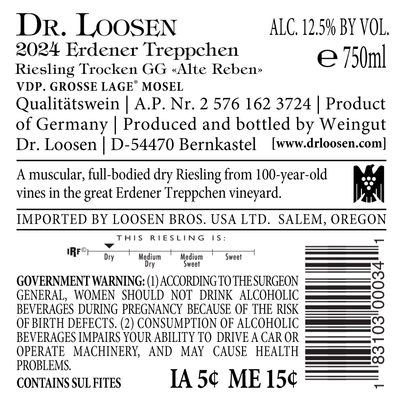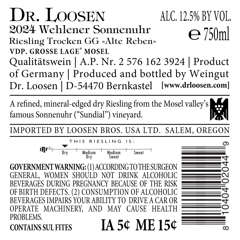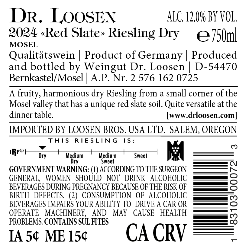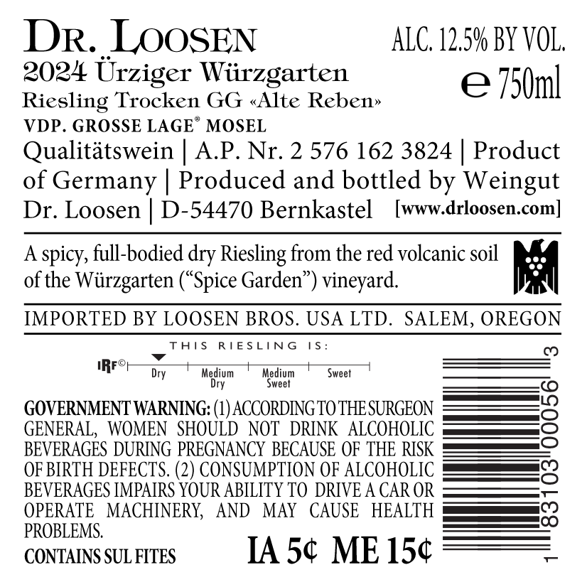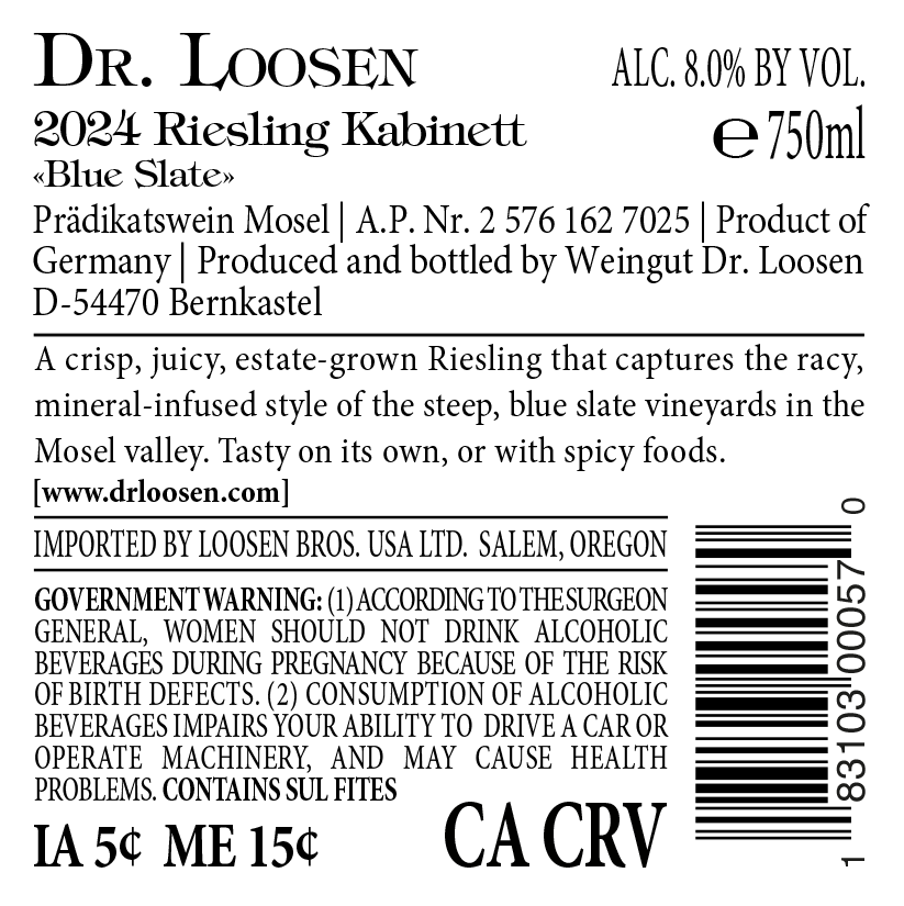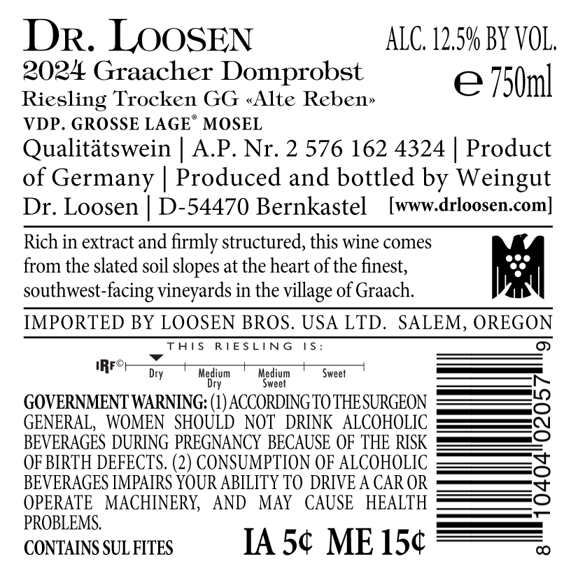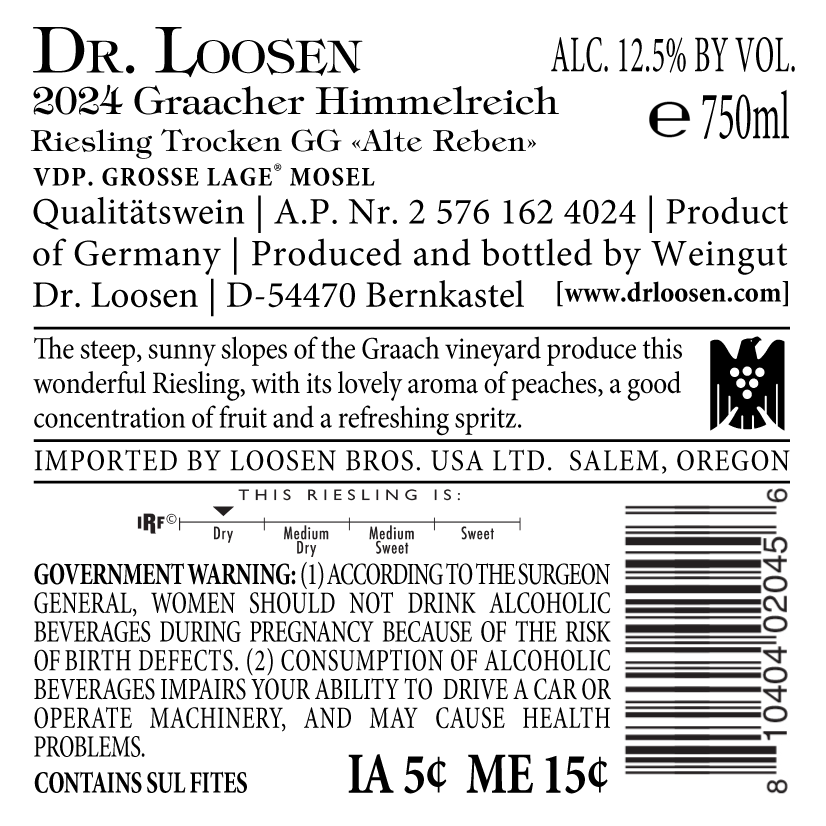 The Dr. Loosen estate has been in the same family for over 200 years. When Ernst Loosen assumed ownership in 1988, he realized that with ungrafted vines averaging 60 years old in some of Germany’s best-rated vineyards, he had the raw materials to create stunningly intense, world-class wines. To achieve this, Ernst dramatically restricts crop size, prohibits chemical fertilization, insists on very strict fruit selection, and employs gentle cellar practices that allow the wine to develop its full potential with a minimum of handling.