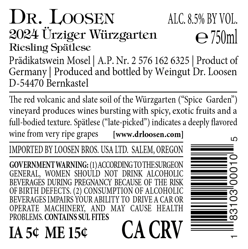 The insanely steep, red-soil Ürziger Würzgarten vineyard produces wines of a completely unique nature in the Mosel valley. The wines showcase the typically juicy and precocious fruit of the “spice garden” vineyard, with a rich mouth feel, brisk acidity and lingering finish. Spätlese is produced with grapes that have a week or two extra hang time, but still without any botrytis. The extra time on the vine gives them higher ripeness and deeper flavors.