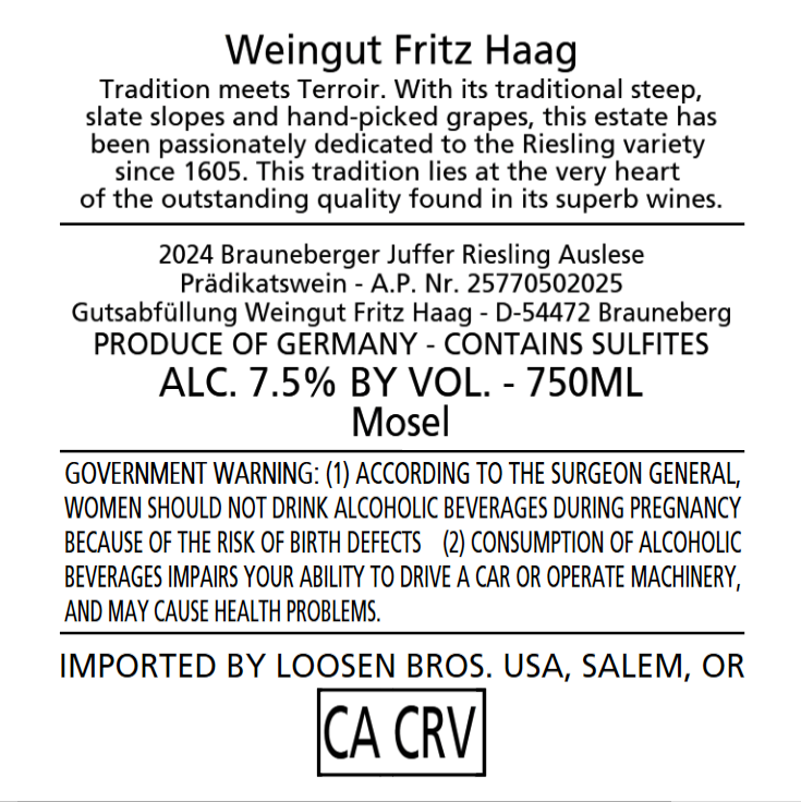 This is a richly concentrated late-harvest Riesling that maintains a lively, light-footed character from its intense slate-soil origins. Sourced from the Juffer vineyard on the terrifyingly steep Brauneberg hillside where the Romans first cultivated grapes in the Mosel in the second century Auslese is a special-selection of late-picked, very ripe clusters with about 50 percent botrytis-affected grapes.