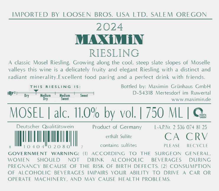 This introductory wine displays the fine character of the Mosel-Ruwer region in the inimitable style of Maximin Grünhaus. It has a charming lightness that makes it hard to resist. Balanced and refreshing with fine, crisp acidity and aromas of fresh apples, mirabelle and pear.