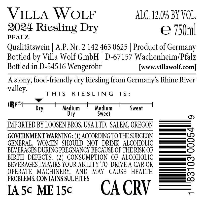 This medium-bodied dry Riesling has lovely flavors of peach and stone, with a hint of apricot. Nicely balanced acidity gives it a juicy grip. It is an excellent match for classic continental-style cooking, especially with dishes that feature freshwater fish, chicken and pork.