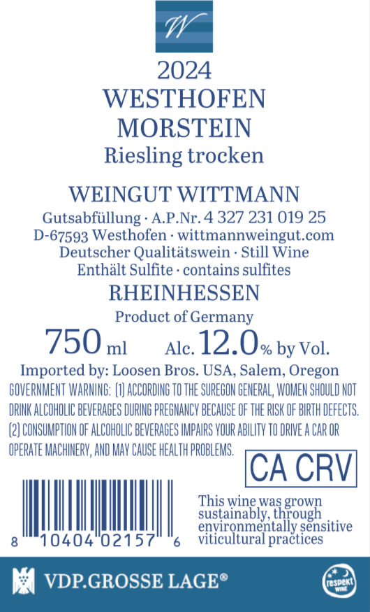 The Morstein vineyard is situated on a south-facing slope that ascends from the glacial valley of the Rhine to the rim of a high plateau, reaching a height of 280 meters (920 ft.) above sea level at an inclination of 20 percent. The vines for the Morstein Rieslings lie in a choice, five-hectare (12.3-acre) parcel of the site. Grosses Gewächs (GG) is the term for an estate’s best dry wine from a classified vineyard.